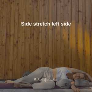 Bring your legs into a 90-degree angle, with one thigh facing the front of the mat. Place a bolster alongside your leg and rest your waist over it and put a pillow under your head. Stretch your top arm overhead for a side body stretch. Slowly guide yourself out and digest before switching sides.